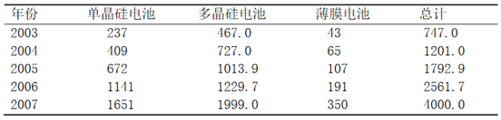 提高光電轉(zhuǎn)換效率和降低生產(chǎn)成本。太陽能光伏電池通常用晶體硅或薄膜材料制造,前者由切割、鑄錠或者鍛造的方法獲得,后者是一層薄膜附著在低價的襯背上。晶體硅仍是當前太陽能光伏電池的主流。晶體硅電池包括單晶硅太陽電池和多晶硅太陽電池。單晶硅電池的實驗室*高轉(zhuǎn)換效率可達24.7%,商業(yè)化電池效率為16%~20%。多晶硅太陽能電池的實驗室*高效率也超過了20%,商業(yè)化電池效率為15%~18%。除效率外,電池的厚度也很重要。降低硅片厚度是減少硅材料消耗、降低晶硅太陽電池成本的有效技術(shù)措施。硅片的平均厚度已從2003年的0.23mm減小到2007年的0.18mm。下表為2003—2007年各類太陽能產(chǎn)量MW