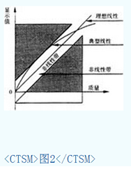 線性檢定是指加載試驗(yàn)時,所加載荷與相應(yīng)示值之間的線性關(guān)系好壞的一種評估,常用天平示值與理想線性直線即從零載到*大秤量的連線之間的正或負(fù)*大偏差值表示,如圖2。