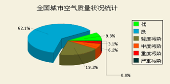 7月7日全國城市空氣質量日報對全國城市空氣質量狀況的檢測結果做了詳細的介紹,其中監(jiān)測指標為空氣質量指數,即air quality index(AQI)。其中,3.1%的城市為重度污染,6.2%的城市為中度污染,19.3%的城市為輕度污染,62.1%的城市空氣質量為良,僅有9.3%的城市空氣質量為優(yōu)。