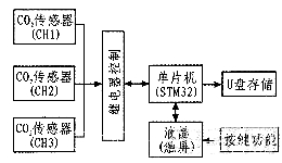 前端傳感器輸出的數(shù)字信號,以串口方式與STM32進行通訊,此儀器設(shè)計三通道采集,利用繼電器電路對傳感器通道進行選擇,STM32將濃度值顯示在液晶屏上,液晶屏帶有觸摸功能,通過編寫液晶顯示界面,調(diào)用相關(guān)按鍵程序,選擇傳感器通道以及保存為U盤數(shù)據(jù)等功能。框圖如圖1所示。