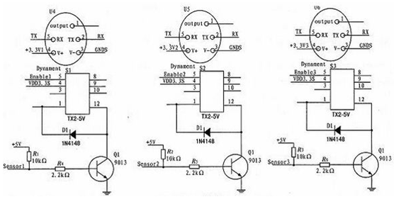 本儀器設(shè)計3個通道的二氧化碳傳感器采集,通過3個繼電器來選擇傳感器的通斷。如圖3為繼電器控制電路。