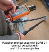 白俄羅斯ATOMTEX AT1125B 為一款輻射檢測儀,用于測量γ輻射劑量及劑量率,外接探頭BDPB-01與主機連接后,還可測量β表面沾污及放射性核素的活度。該款輻射檢測儀能夠用于搜查放射源、檢測廢金屬等。儀器內(nèi)置 NaI(TI)閃爍體探測器,可快速*地對較小的輻射改變做出響應(yīng)。 此外,儀器的校正功能(能量范圍 0.05...3MeV),使得儀器的劑量率測量更加*。BDPB-01 帶有 1.7m 延長桿, 使得測量非常方便。